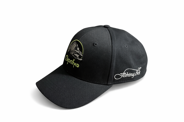 Gapshad Cap für Raubfischangler: hochwertiges Snapback-Cap mit besticktem Gapshad-Logo und Talsperrenangelguiding sowie Fishing-Art-Schriftzug an den Seiten. Bequemer Sitz, robustes Material und stylisches All-Black-Design – perfekt fürs Angeln und den Alltag.